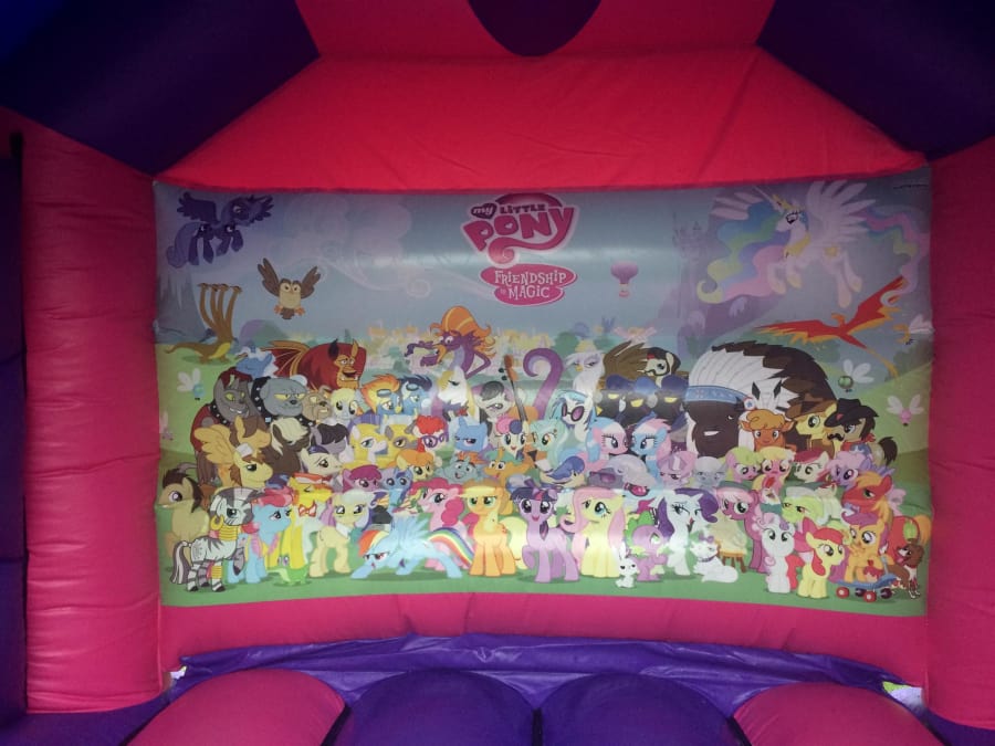 This is our BRAND NEW My Little Pony Bouncy Castle- Perfect for all special occasions including Birthday parties, Communions, Christenings plus many more. The front and back panels of this bouncy castle is embellished with artwork of the magical ponies, come and join Twilight Sparkle, Apple Bloom, Applejack, Princess Cadance, Fluttershy, Scootaloo, and Sweetie belle plus all their friends.