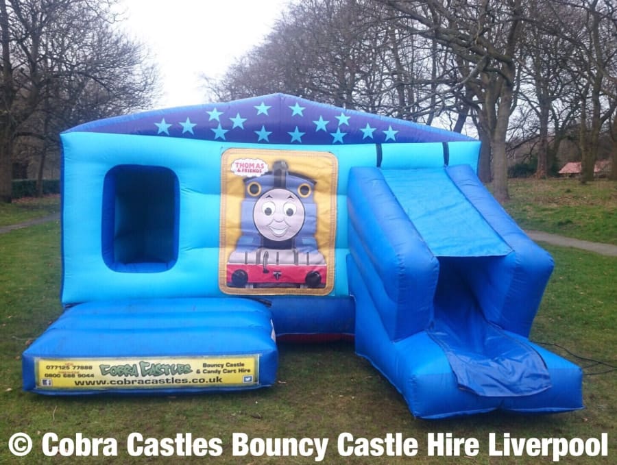 Choo choo! Hire this Thomas the Tank Engine bouncy castle for parties in Merseyside, Liverpool and nearby areas. It's perfect for all fans of the world-famous train, and comes emblazoned with gorgeous images of Thomas and friends.
