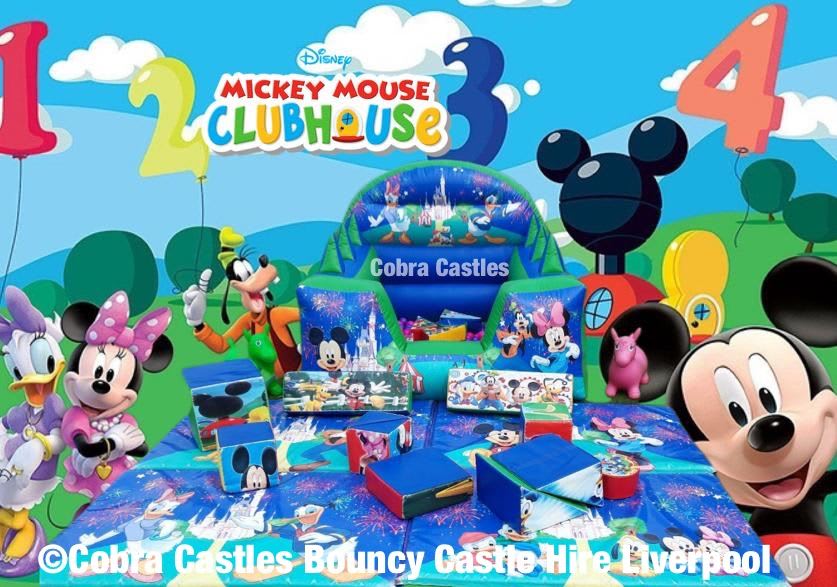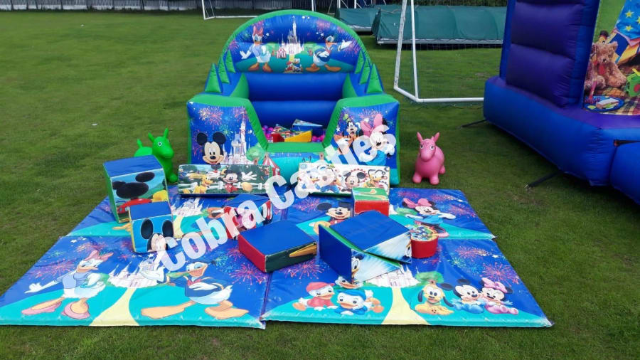 Our Mickey soft play package comes with printed foam soft play set, hoppers, and foam matting, and inflatable ball pool.